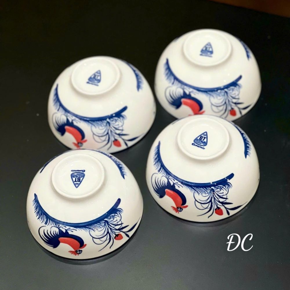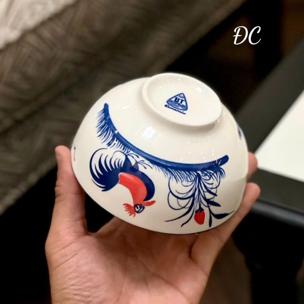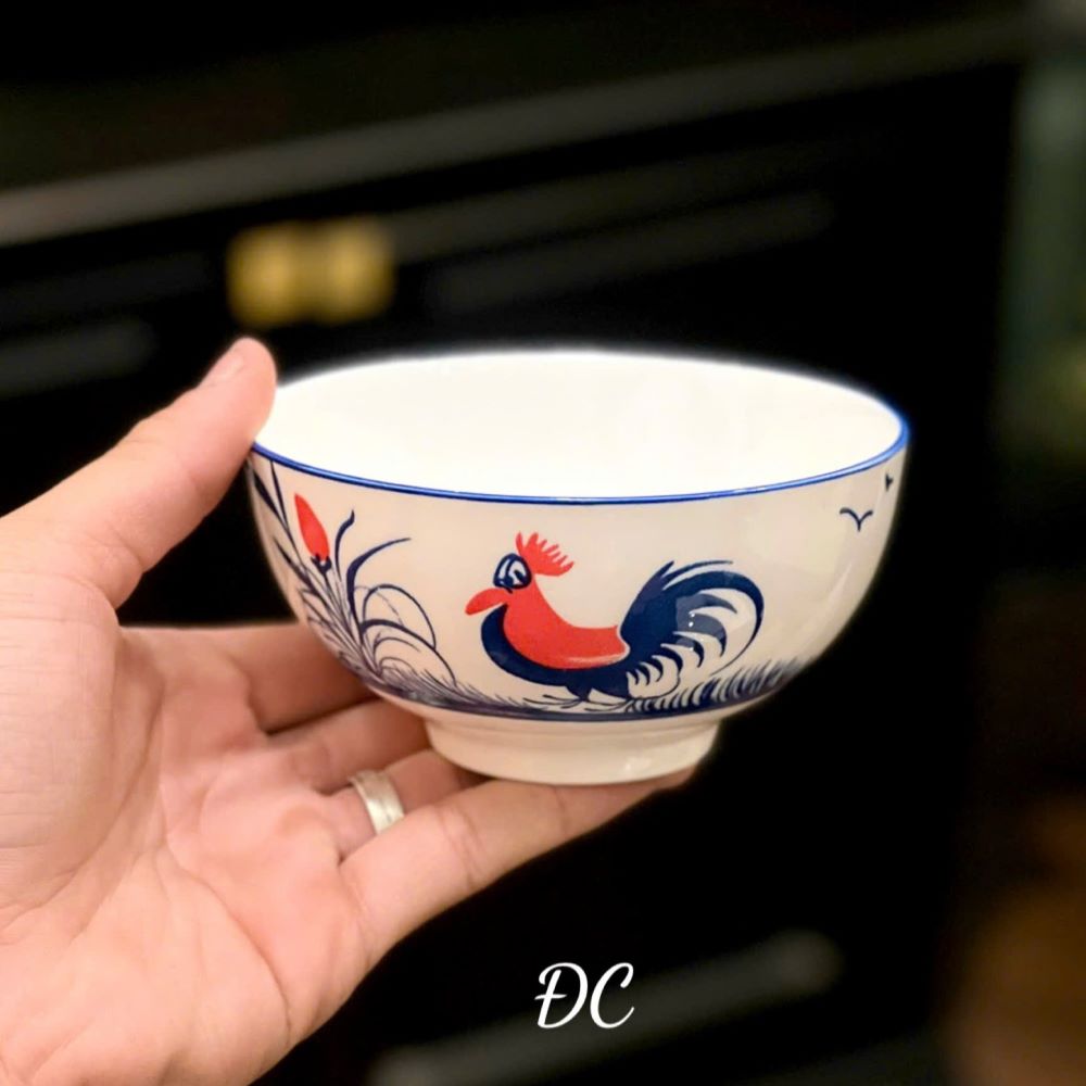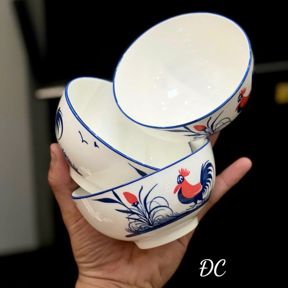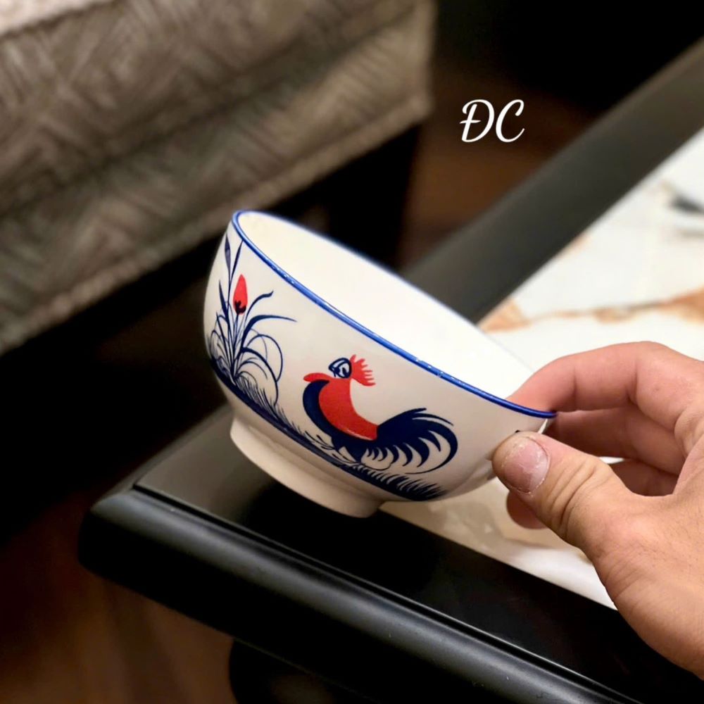 Bộ chén sứ với họa tiết con gà được vẽ tỉ mỉ bằng tay trên nền sứ trắng tinh tế. Sự kết hợp hài hòa giữa màu xanh dương của lông gà và điểm nhấn màu đỏ tạo nên vẻ đẹp truyền thống mà vẫn mang hơi thở hiện đại, phù hợp với nhiều phong cách trang trí bàn ăn.