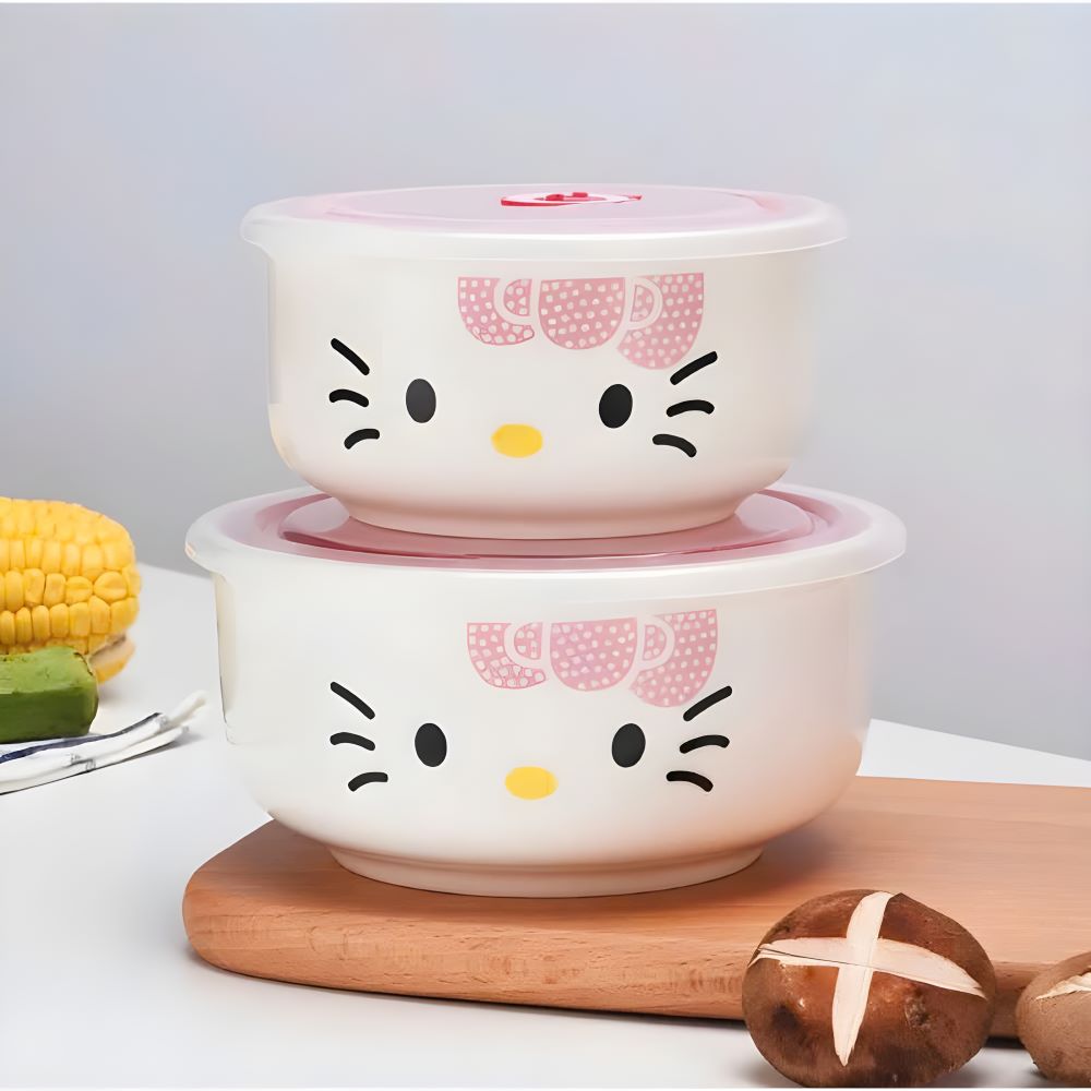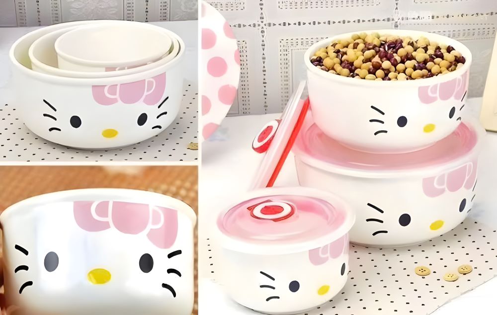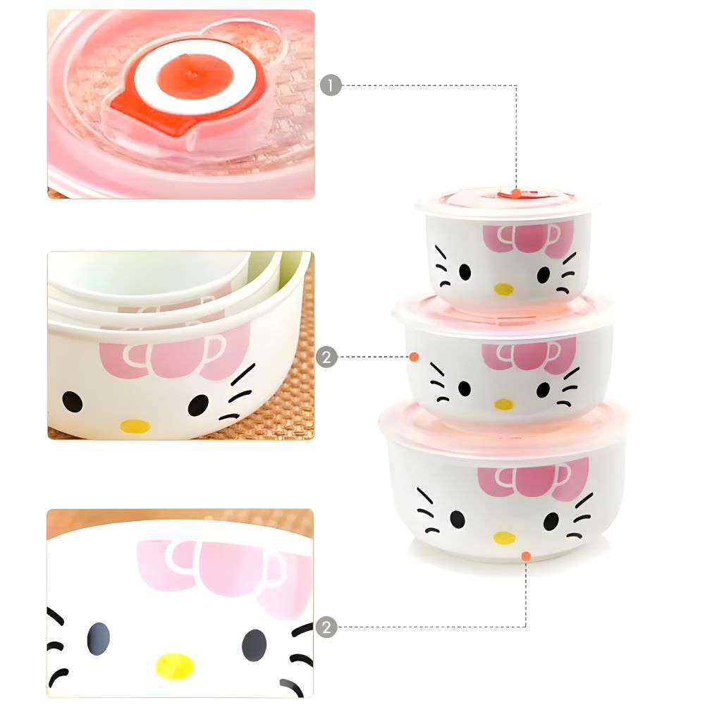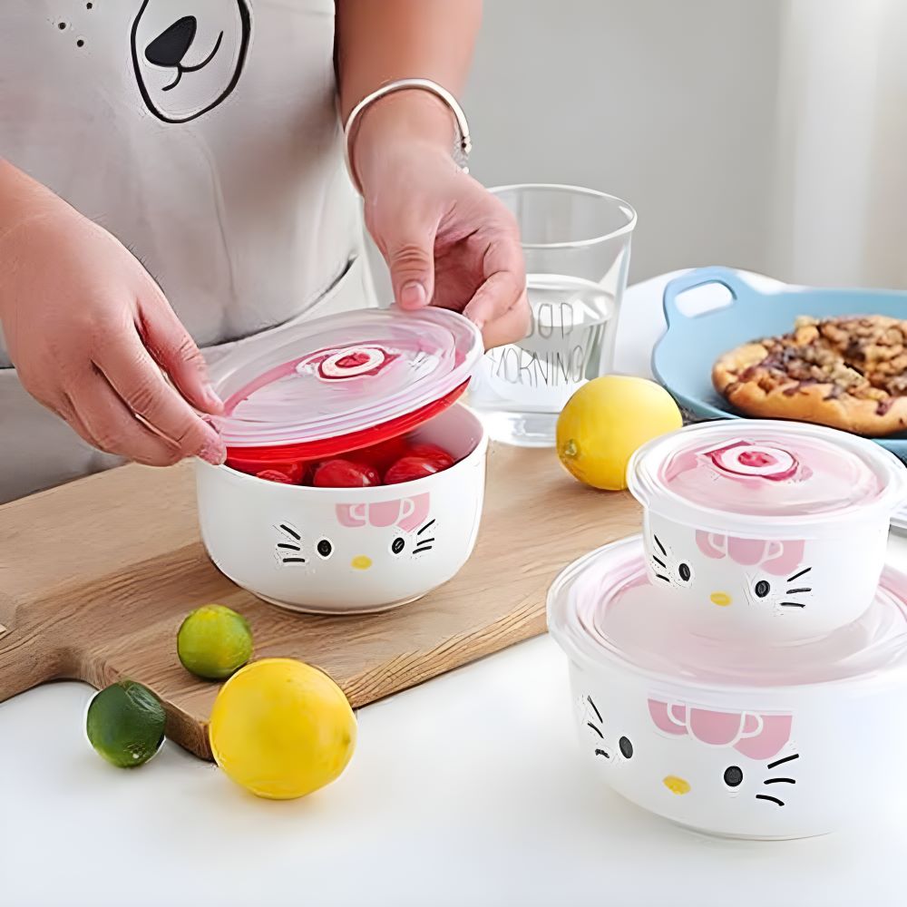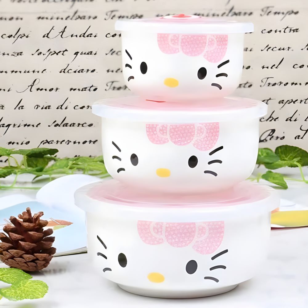 Bộ 3 Thố Sứ Hello Kitty Có Nắp Hút Chân Không - Thiết Kế Dễ Thương Và Đa Năng
