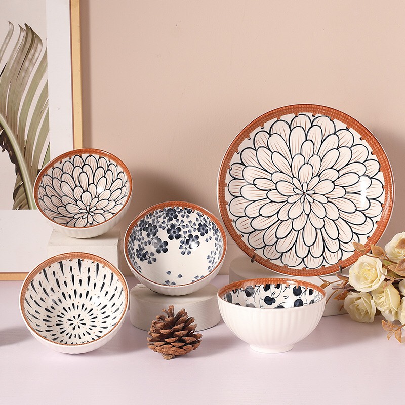 🔸 Bộ 5 bát đĩa hoạ tiết kèm đũa muỗng được cấu tạo từ sứ cao cấp, mang lại sự tinh tế và đậm bản sắc của phong cách Nhật Bản.