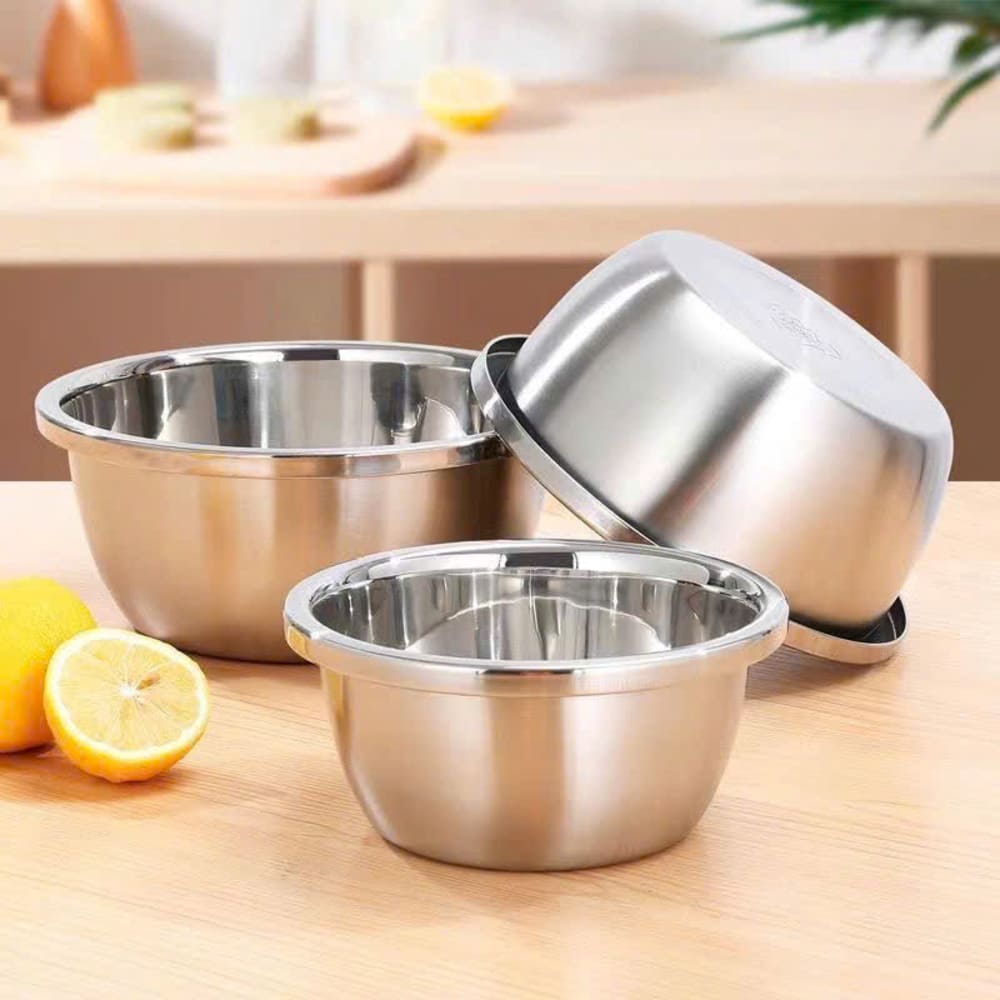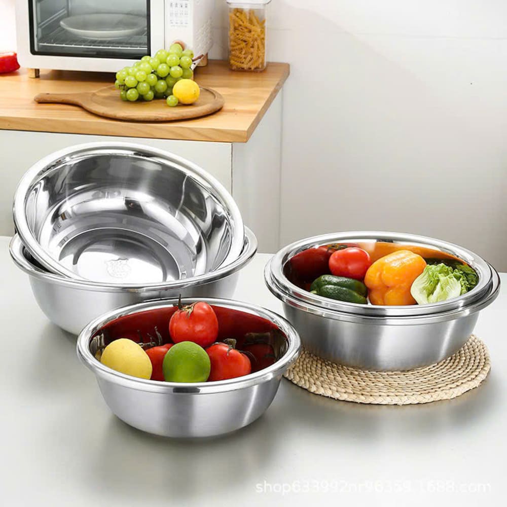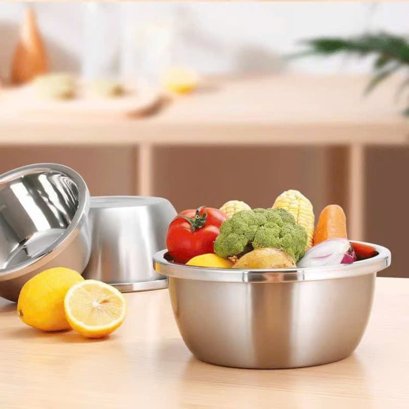 Bộ 5 thau inox đựng thực phẩm size 18-26cm là lựa chọn tiện lợi và đa năng cho căn bếp gia đình hoặc quán ăn. Chất liệu inox cao cấp sáng bóng, bền bỉ, không gỉ, giúp bảo quản và sơ chế thực phẩm an toàn. Bộ thau có nhiều kích thước từ 18cm đến 26cm, phù hợp đựng rau củ, trái cây, bột, hạt, hay dùng trộn salad, sơ chế thịt cá.