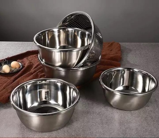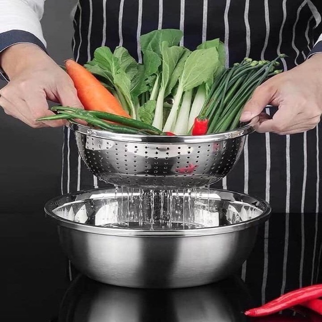 MÔ TẢ: Bộ thau rổ Inox không gỉ 5 món tiện dụng-dày dặn thông thoáng-thoát nước nhanh chóng không ám mùi-sang trọng gian bếp