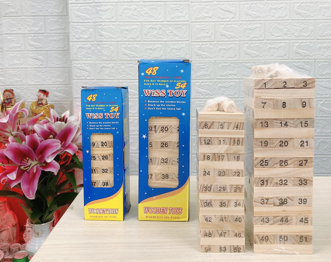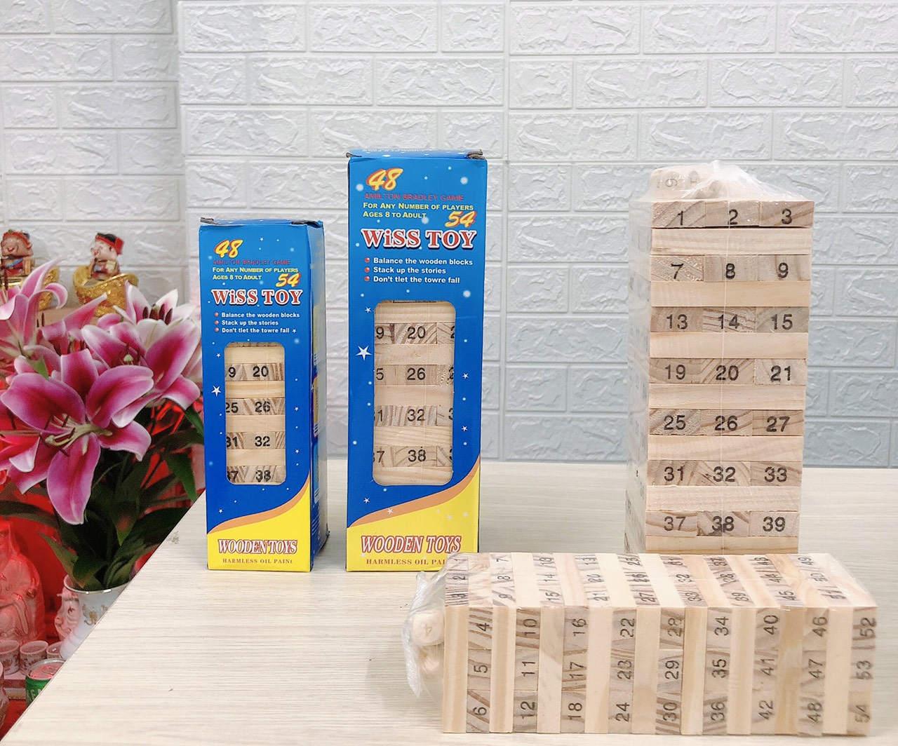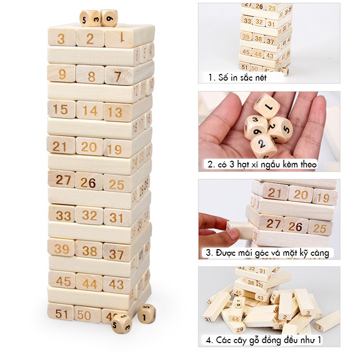 🔸 Mô tả: 54 thanh được khắc số từ 1 đến 54; 4 hạt xí ngầu được khắc số từ 1 đến 6