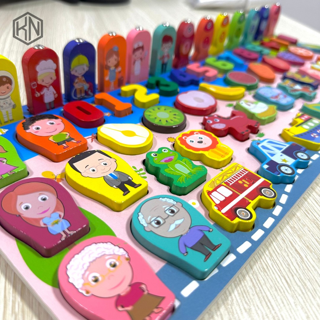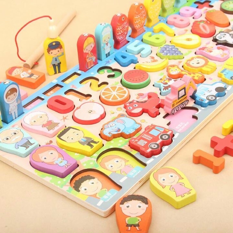 Các bé tha hồ sáng tạo trò chơi: ghép số, xếp vòng tương ứng các số, câu cá. Mặt sau của cá cũng có số để xếp đúng vị trí và học cộng trừ linh hoạt.
