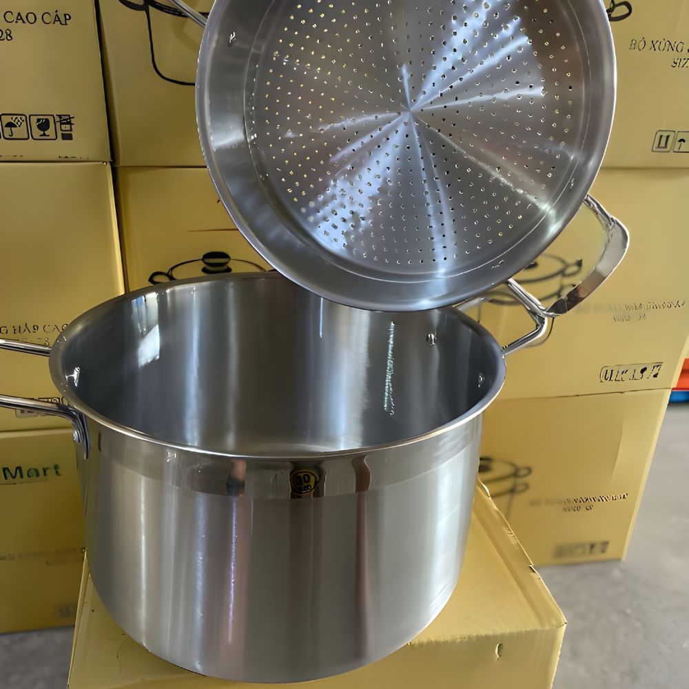 Quai nồi và xửng làm bằng inox đặc, thiết kế to bản và gắn với thân nồi bằng đinh tán chắc chắn, cho khả năng chịu lực tốt. Thiết kế này giúp người dùng dễ dàng nâng nhấc và di chuyển nồi trong quá trình sử dụng, ngay cả khi nồi đầy thực phẩm.
