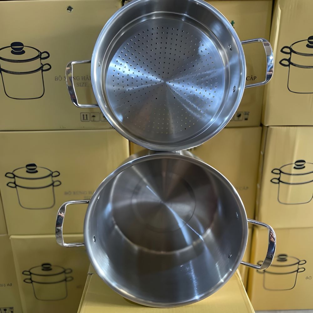 Bộ nồi hấp 2 tầng Kamira từ tổng kho sỉ gia dụng Linh Kiện Khánh Nhân có tính đa dụng cao, đáp ứng nhiều phương pháp nấu ăn khác nhau. Sản phẩm có thể sử dụng để hấp các loại bánh, rau củ, thịt cá, hoặc như một nồi thông thường để nấu cơm, canh, súp, lẩu... Thiết kế 2 tầng cho phép hấp đồng thời nhiều loại thực phẩm khác nhau, giúp tiết kiệm thời gian và nhiên liệu.