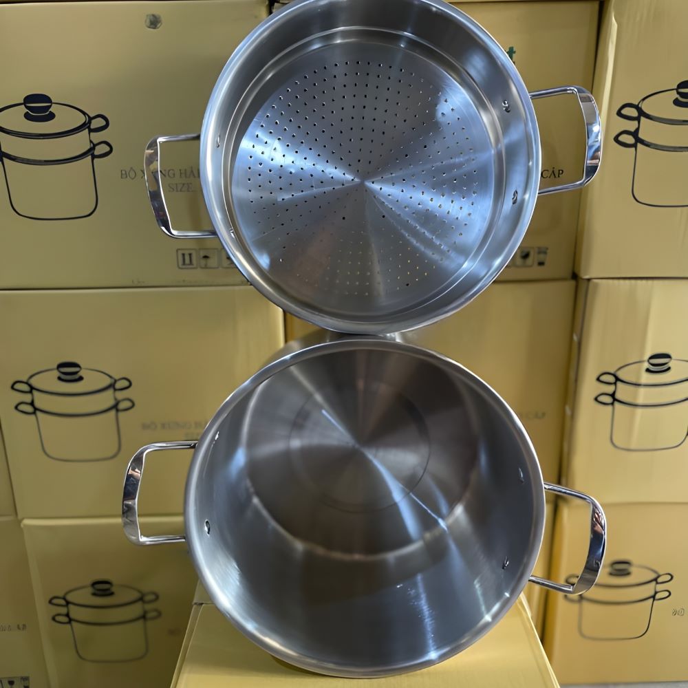 Bộ nồi hấp 2 tầng Kamira từ tổng kho sỉ gia dụng Linh Kiện Khánh Nhân có tính đa dụng cao, đáp ứng nhiều phương pháp nấu ăn khác nhau. Với thiết kế hai tầng riêng biệt, sản phẩm cho phép bạn hấp đồng thời nhiều loại thực phẩm khác nhau như rau củ, thịt cá, bánh bao, xíu mại... mà không lo bị trộn lẫn hương vị.