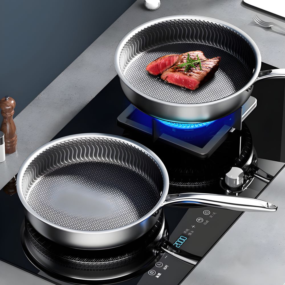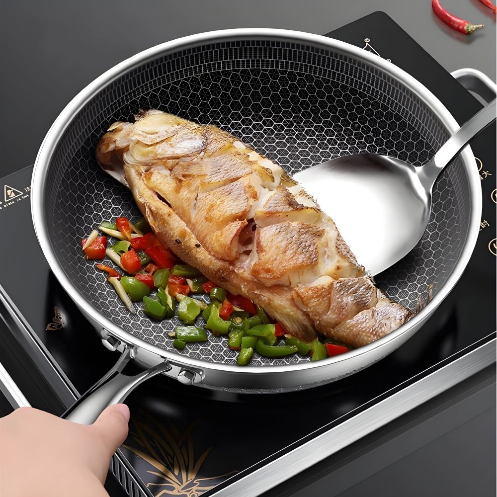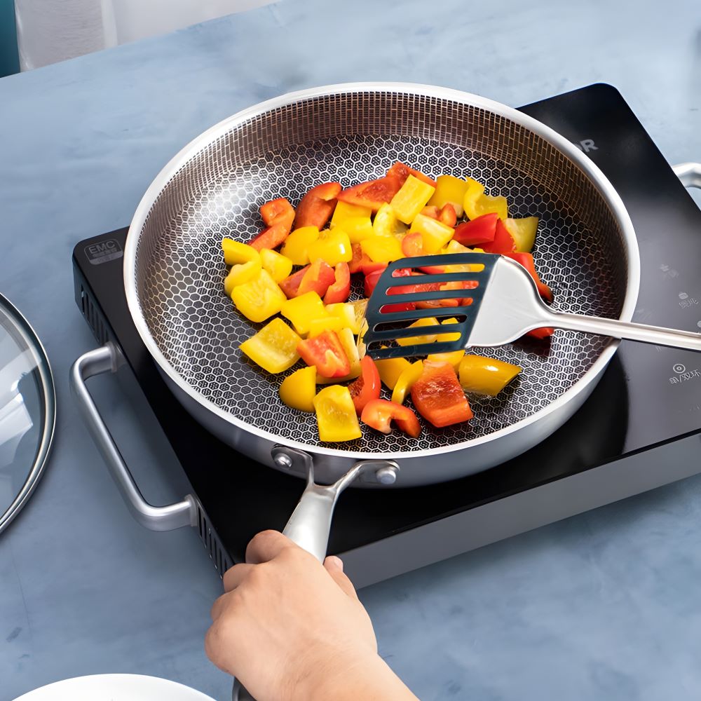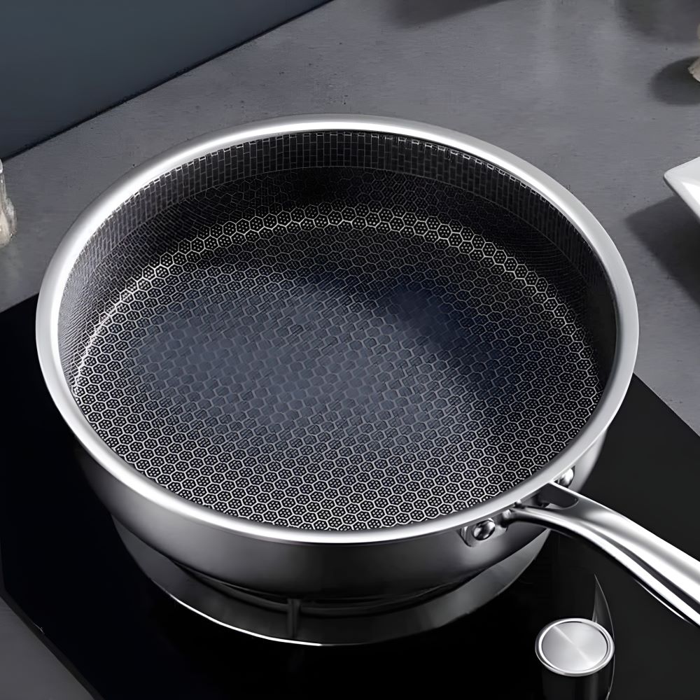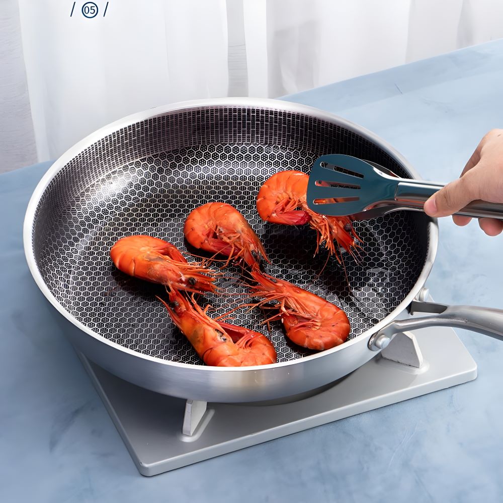 Chảo inox 5 lớp với lớp chống dính được khắc laser họa tiết tổ ong độc đáo mang đến giải pháp hoàn hảo cho những ai yêu thích nấu nướng. Không còn phải lo lắng về chảo gang quá nặng hay chảo đá dễ bay lớp chống dính, sản phẩm này kết hợp ưu điểm của cả hai loại, tạo nên dụng cụ bếp vừa nhẹ nhàng vừa bền bỉ.