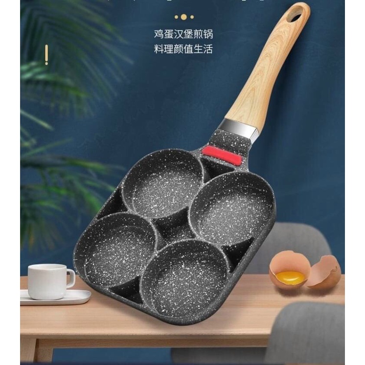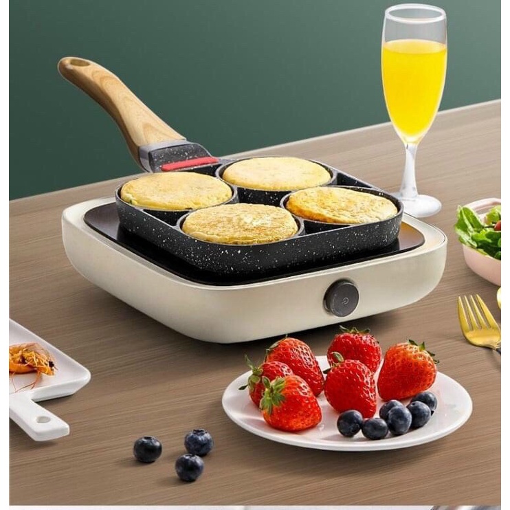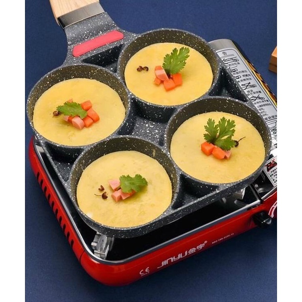 Chảo chống dính chia 4 ngăn - Chảo chống dính 4 ngăn chiên trứng làm bánh với tay cầm gỗ