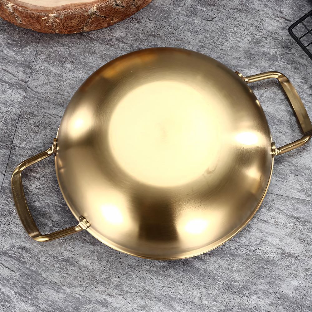Trang trí không gian bếp: Ngoài công năng sử dụng, chảo inox mạ vàng còn là món đồ trang trí nổi bật cho không gian bếp, tạo điểm nhấn sang trọng và hiện đại.