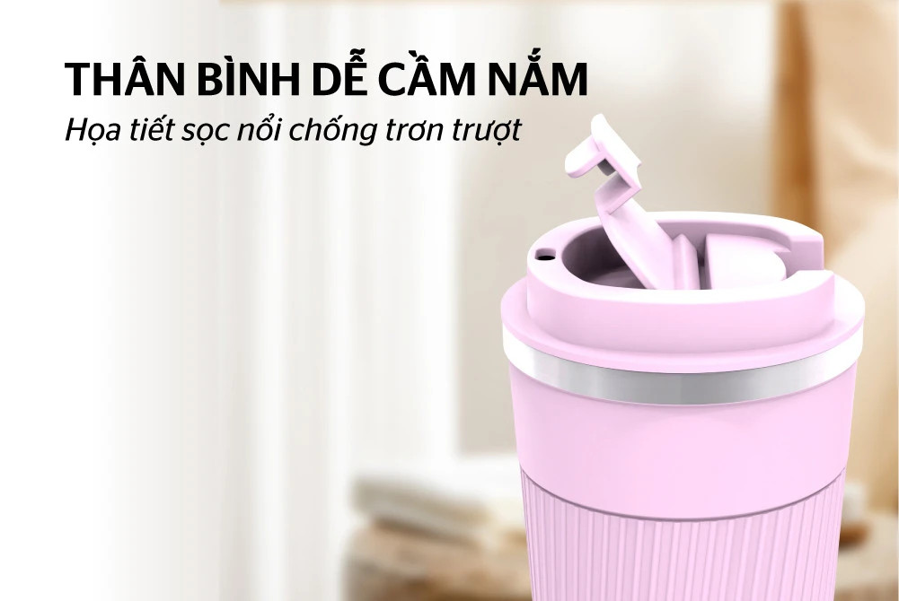 - Lớp họa tiết sọc nổi trên thân giúp dễ dàng cầm nắm, chống trơn trượt, tuột tay. Nút nhấn mở tiện lợi sử dụng để uống trực tiếp.