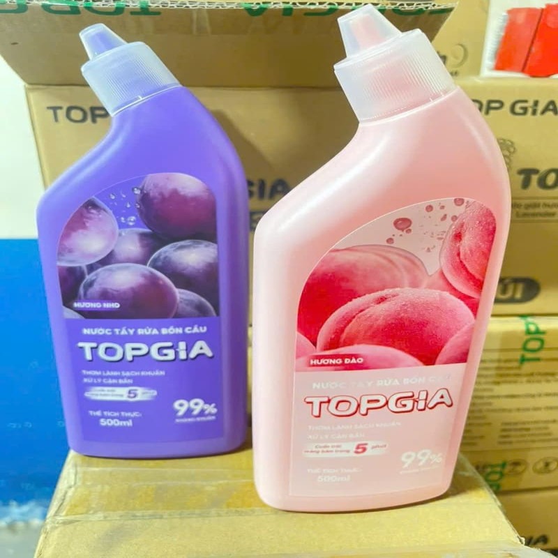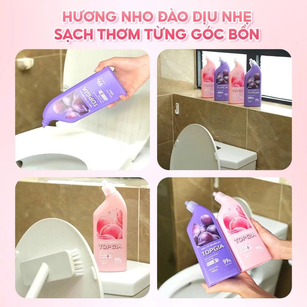 Combo 4 chai nước tẩy bồn cầu Topgia hương nho đào giúp làm sạch sâu – khử mùi hiệu quả – giữ toilet luôn thơm mát. Công thức tẩy rửa mạnh mẽ giúp đánh bay mảng bám, vết ố vàng, cặn bẩn lâu ngày trong bồn cầu, mang lại không gian vệ sinh sạch sẽ, dễ chịu cho gia đình, cửa hàng, quán ăn. 🍇🍑