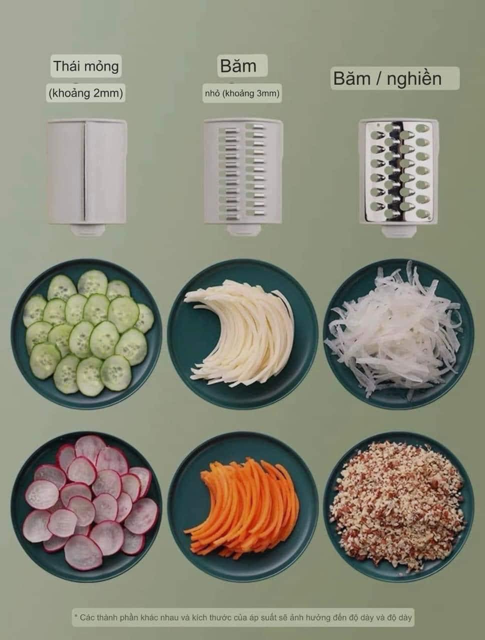 🌿 Bộ sản phẩm đầy đủ gồm: 1 thân máy, 3 đầu: nạo sợi to, nạo sợi nhỏ, cắt lát.