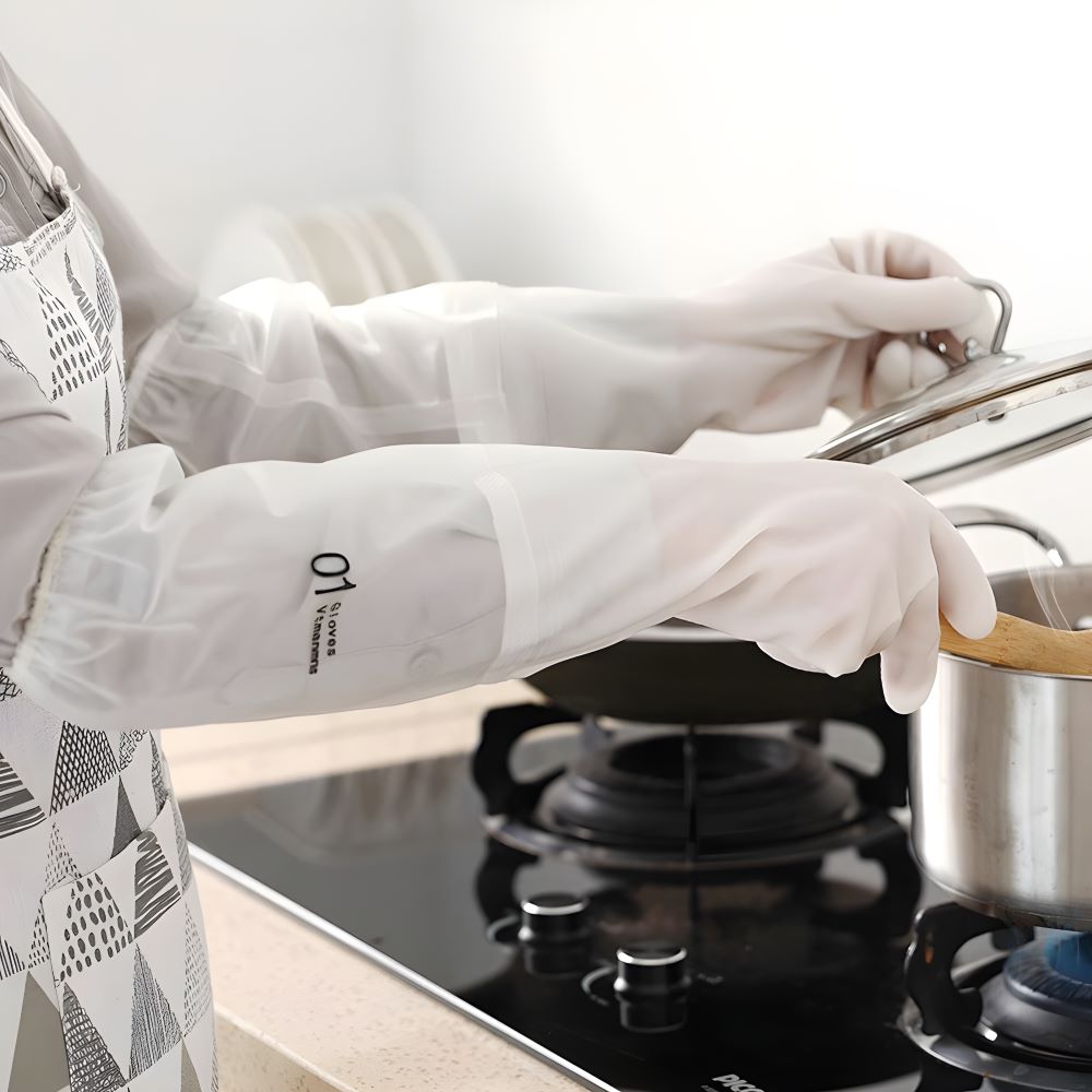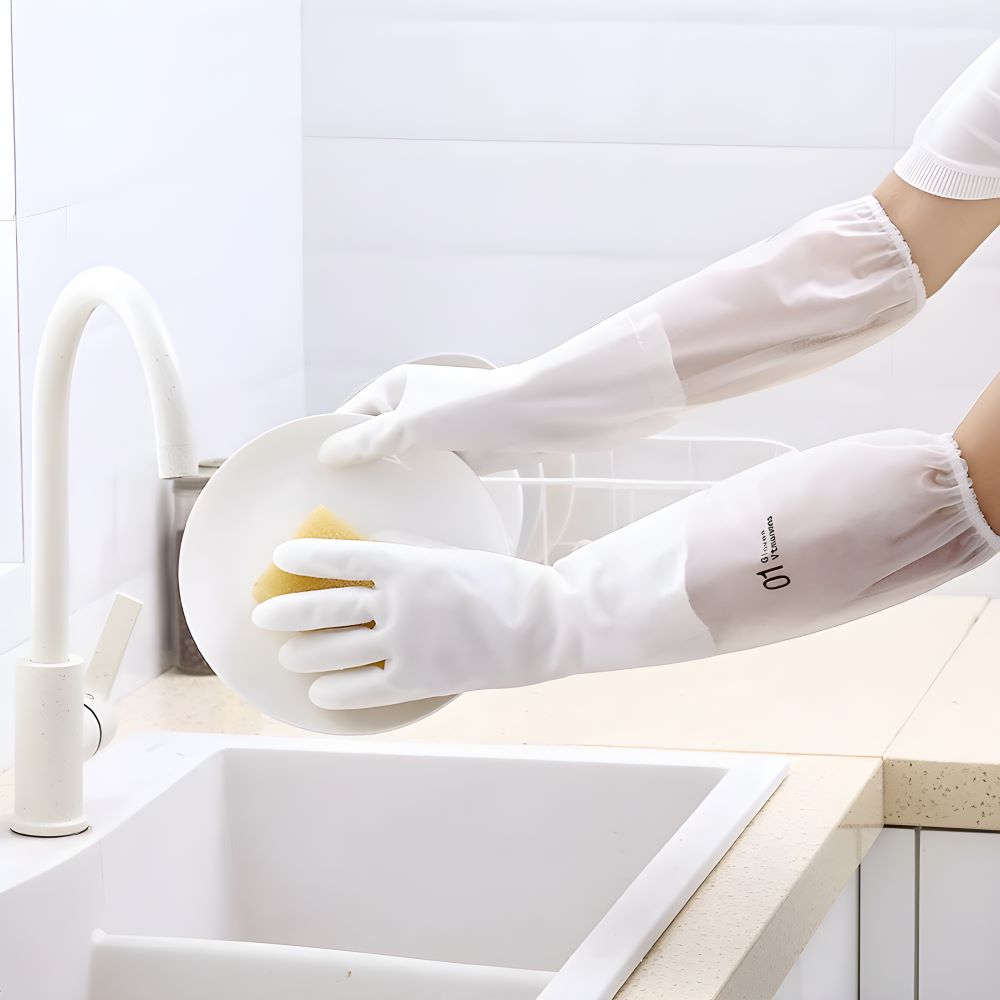 Găng tay cao su rửa chén bát được thiết kế với độ dài đặc biệt, trùm qua khuỷu tay, giúp bảo vệ toàn diện không chỉ bàn tay mà còn cả phần cánh tay khỏi nước, chất tẩy rửa hay thực phẩm bẩn trong quá trình làm việc. Phần cổ tay được trang bị dây chun co giãn, ôm khít vào tay, ngăn không cho nước và chất bẩn xâm nhập vào bên trong găng tay.