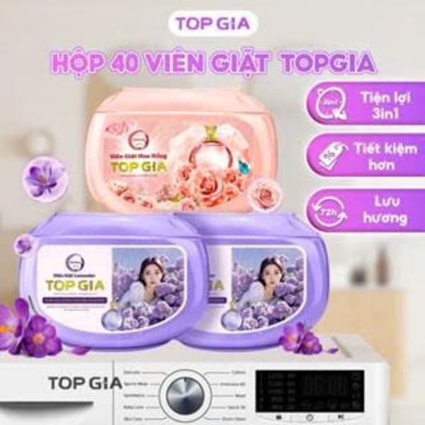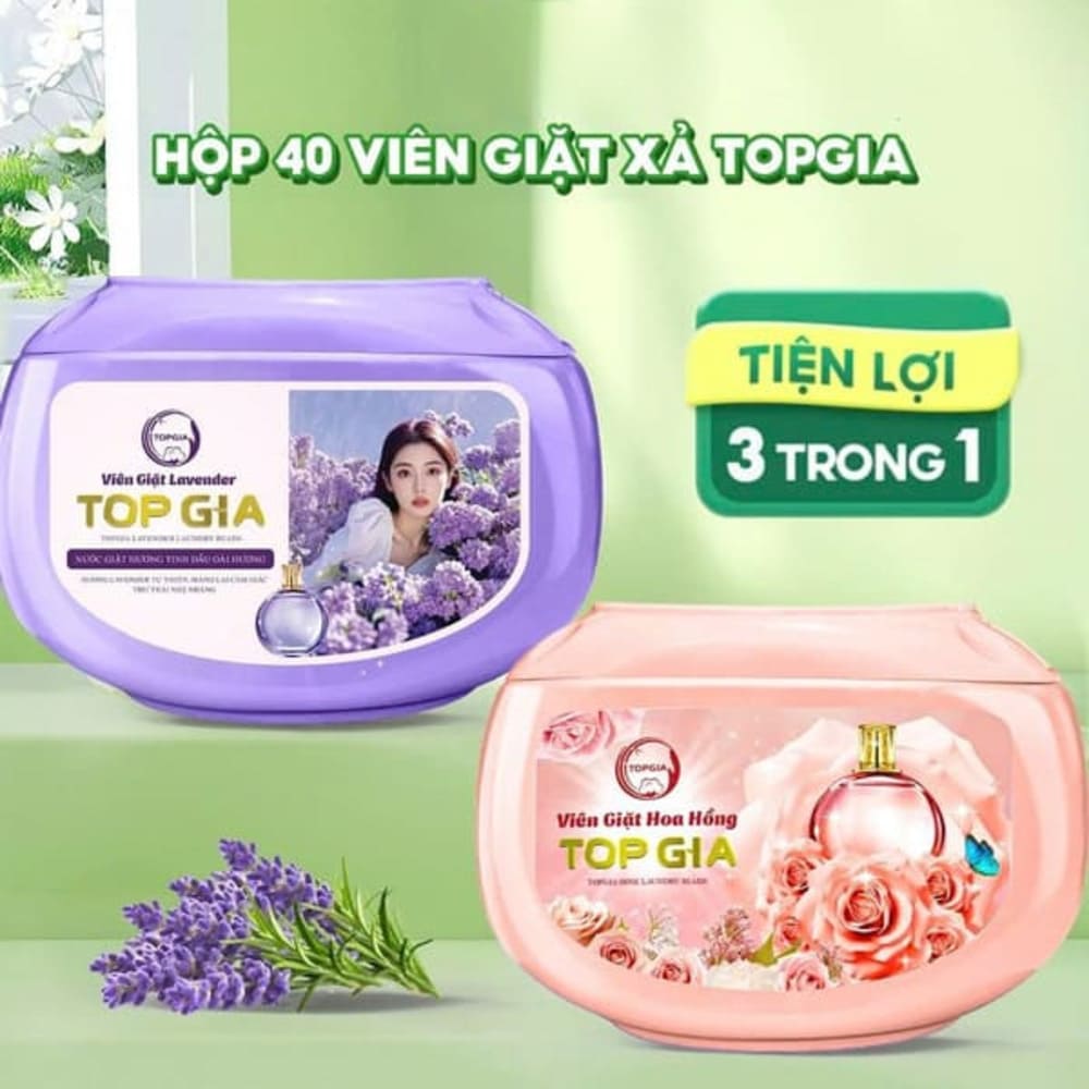 Hộp 40 viên giặt xả TOPGIA hương thơm thiên nhiên giúp giặt sạch quần áo, làm mềm vải và lưu giữ hương thơm dễ chịu lâu dài. Sản phẩm tiện lợi, dễ sử dụng, phù hợp cho gia đình bận rộn hoặc mang đi du lịch, mang lại quần áo thơm mát, mềm mại và luôn như mới.