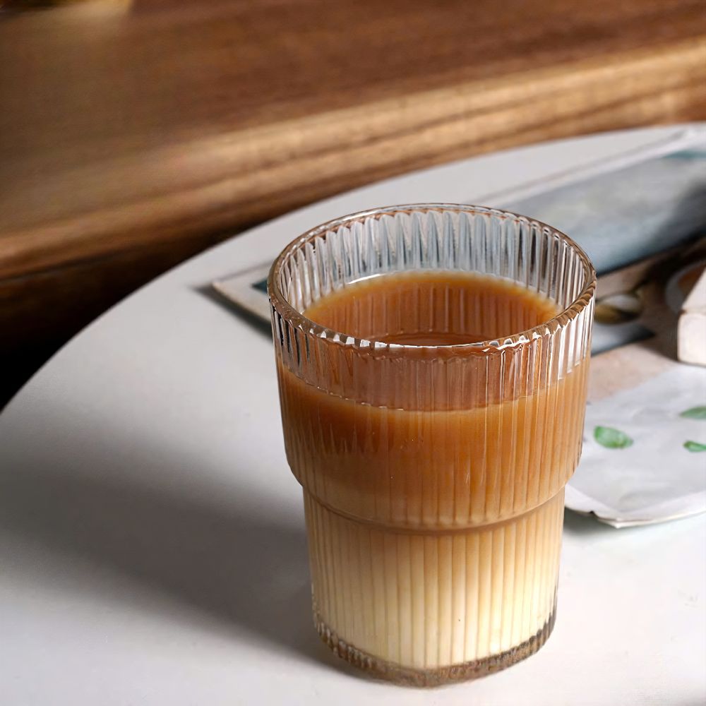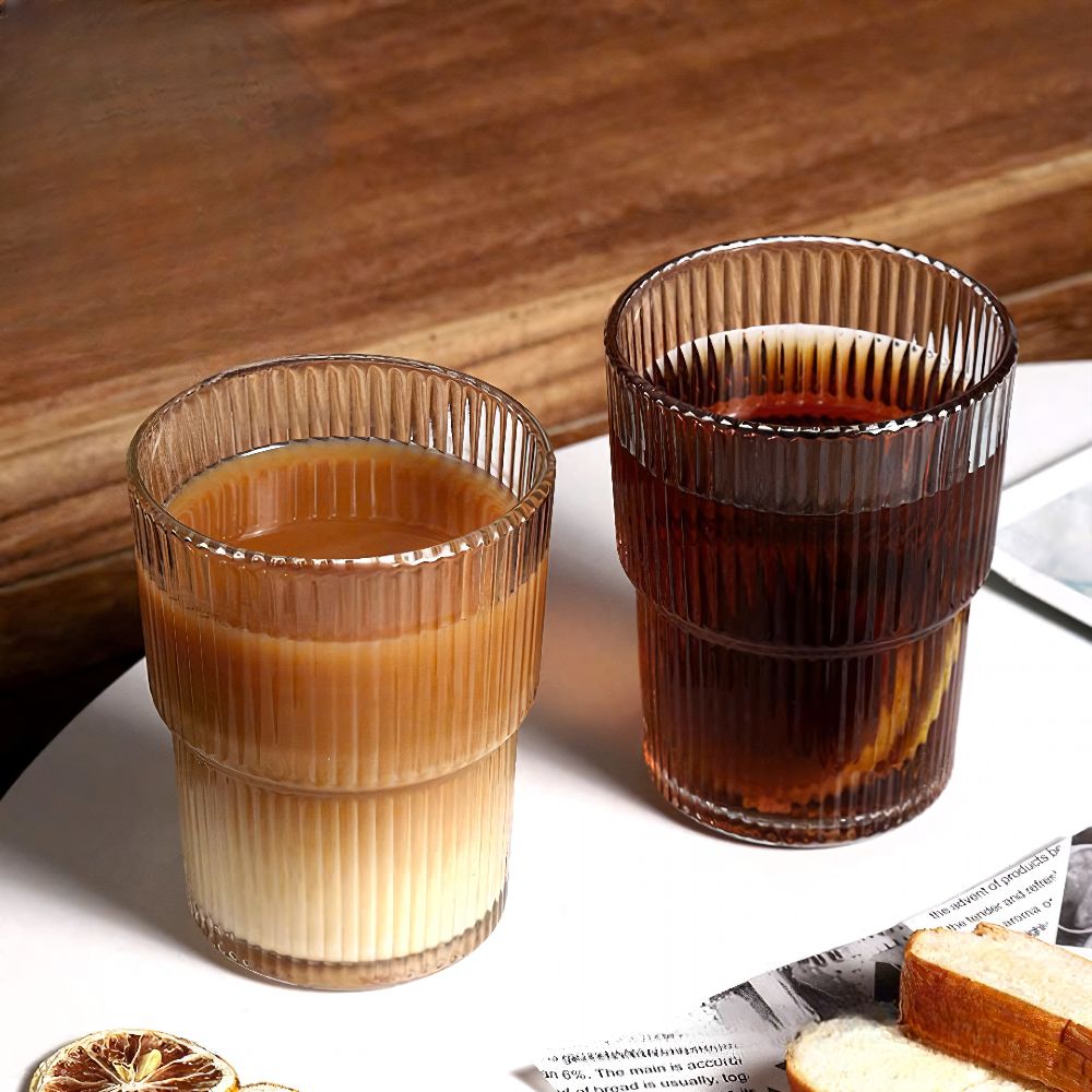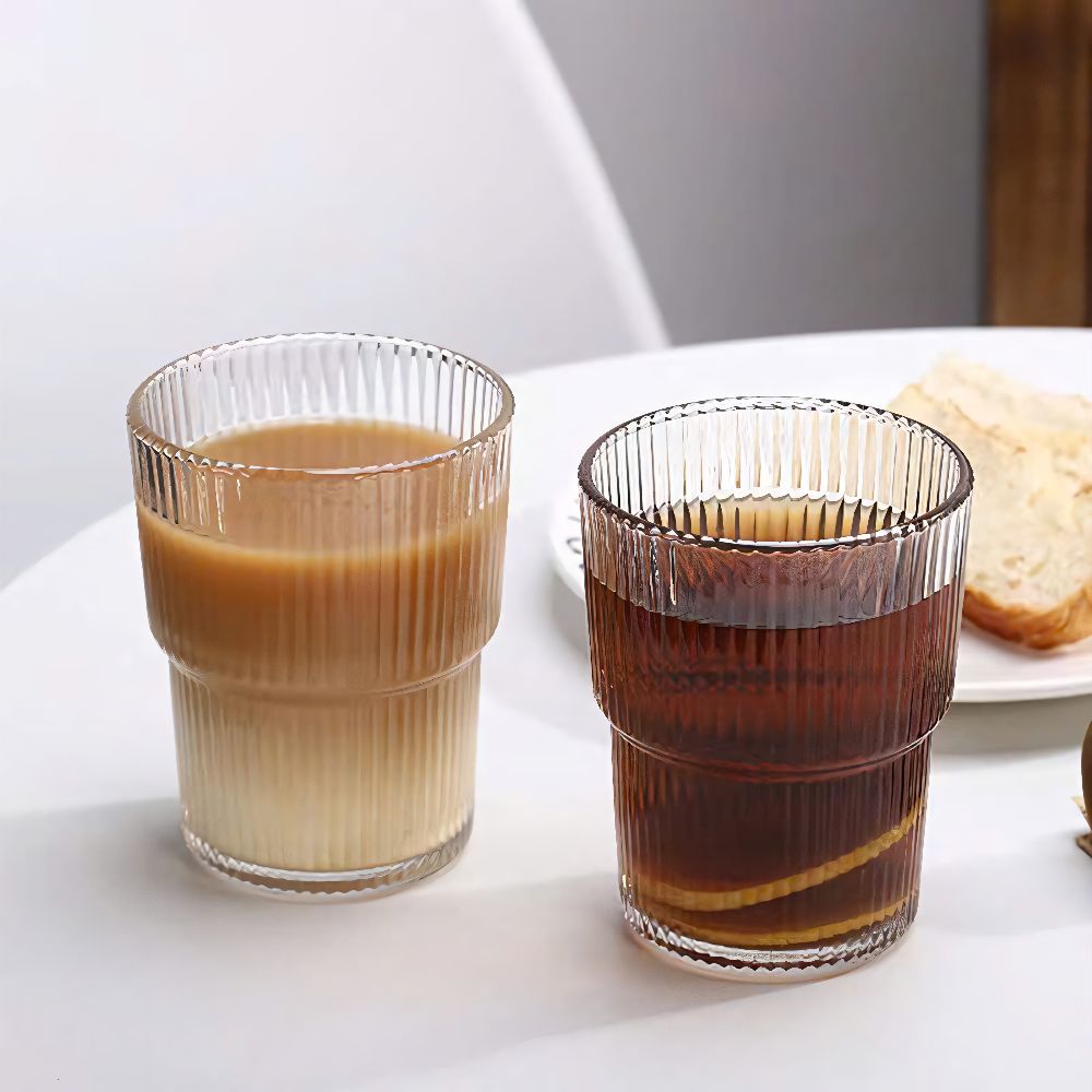 Họa tiết kẻ sọc dọc kết hợp với thiết kế hai tầng mang đến một vẻ đẹp cổ điển nhưng không kém phần hiện đại. Khi đổ nước hoặc trà vào, ánh sáng phản chiếu qua lớp thủy tinh tạo hiệu ứng lung linh, giúp nâng tầm trải nghiệm thưởng thức.