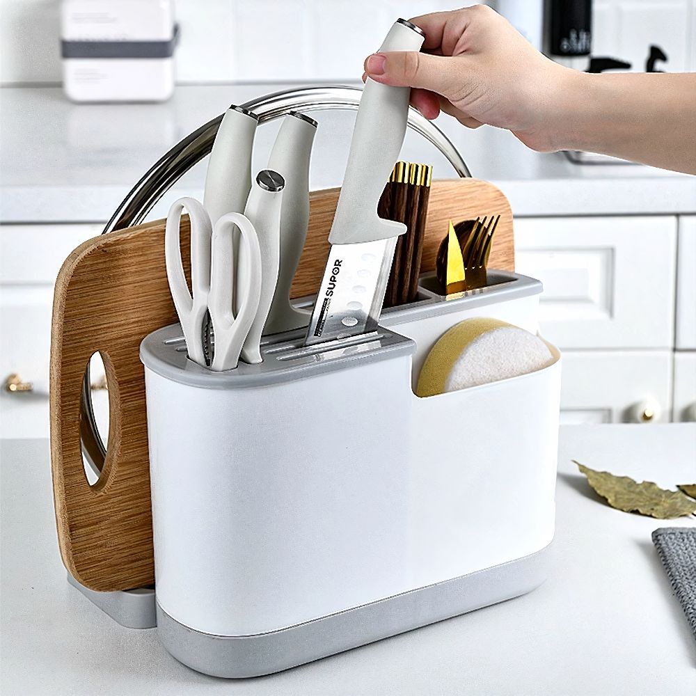 Kệ để dao thớt, đũa muỗng đa năng bằng nhựa là giải pháp sắp xếp thông minh cho căn bếp hiện đại, giúp không gian nấu nướng trở nên ngăn nắp và hiệu quả hơn. Sản phẩm do Tổng kho đồ gia dụng Linh Kiện Khánh Nhân phân phối với cam kết "TIỆN ÍCH – CHẤT LƯỢNG – GIÁ RẺ".