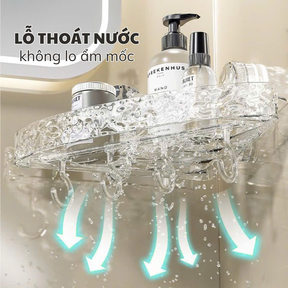 Thiết kế này đặc biệt hữu ích cho các vật dụng ướt như xà phòng, bàn chải, có thể được đặt trực tiếp lên kệ mà không lo ngấm nước hay tạo môi trường cho vi khuẩn phát triển. Nước sẽ tự động thoát ra ngoài, giữ cho kệ luôn khô ráo và vệ sinh.