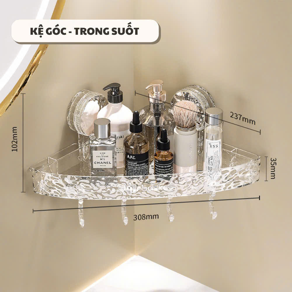 Chất liệu acrylic trong suốt cao cấp tạo cảm giác nhẹ nhàng, thanh thoát cho không gian, không gây cảm giác chật chội hay nặng nề như các loại kệ kim loại hay gỗ thông thường. Đặc biệt, thiết kế trong suốt giúp dễ dàng quan sát và tìm kiếm đồ dùng, đồng thời phù hợp với mọi phong cách trang trí nội thất.