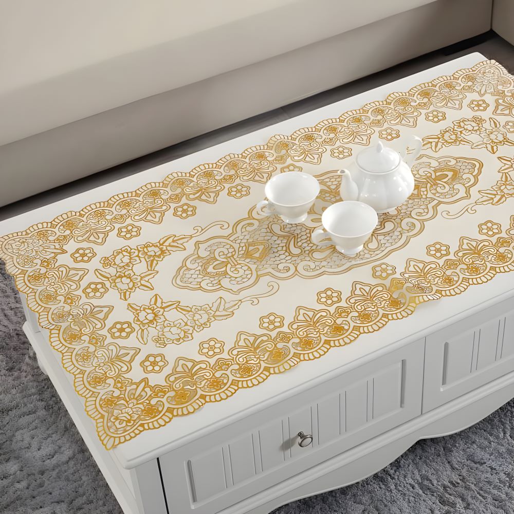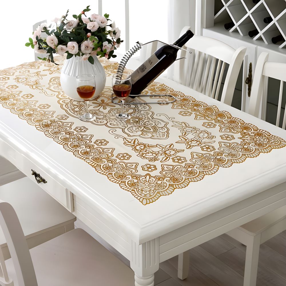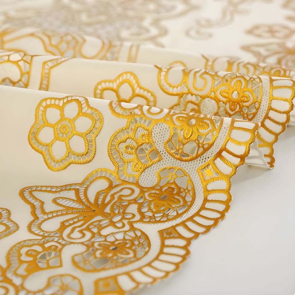 Khăn trải bàn gây ấn tượng với hoa văn dập nổi tinh xảo mang âm hưởng cổ điển châu Âu. Những đường viền hoa lá uốn lượn mềm mại kết hợp cùng họa tiết hoa geometric được phủ lớp nhũ vàng lấp lánh, tạo nên bức tranh trang nhã trên nền trắng kem thanh lịch. Thiết kế này mang đến vẻ đẹp sang trọng nhưng không kém phần ấm cúng cho không gian sống.