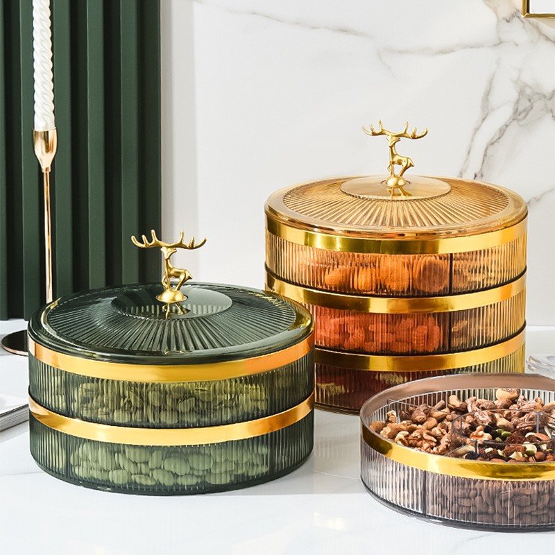 - Khay đựng bánh kẹo gồm 2 tầng 6-8 hũ, và có nắp đậy giúp bạn bảo quản mứt bánh luôn được thơm ngon và vệ sinh.