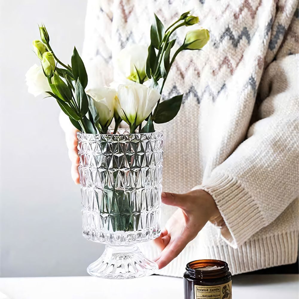 Ly cắm hoa sở hữu kiểu dáng sang trọng, với phần thân được trang trí bằng hoa văn vân sọc nổi, tạo hiệu ứng ánh sáng lung linh khi đặt dưới ánh đèn. Thiết kế này không chỉ giúp ly trở nên bắt mắt, tinh tế mà còn mang lại vẻ đẹp cổ điển xen lẫn hiện đại.