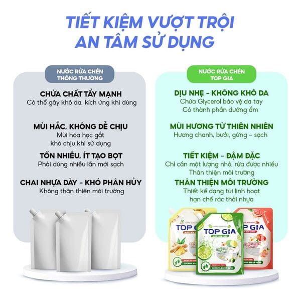Bạn muốn rửa sạch bát đĩa nhanh chóng mà vẫn an toàn cho da tay? Nước rửa chén Topgia hương thiên nhiên túi 2L với công thức đậm đặc, tạo bọt nhanh, giúp đánh bay dầu mỡ cứng đầu và giữ bát đĩa sáng bóng, thơm nhẹ tự nhiên.