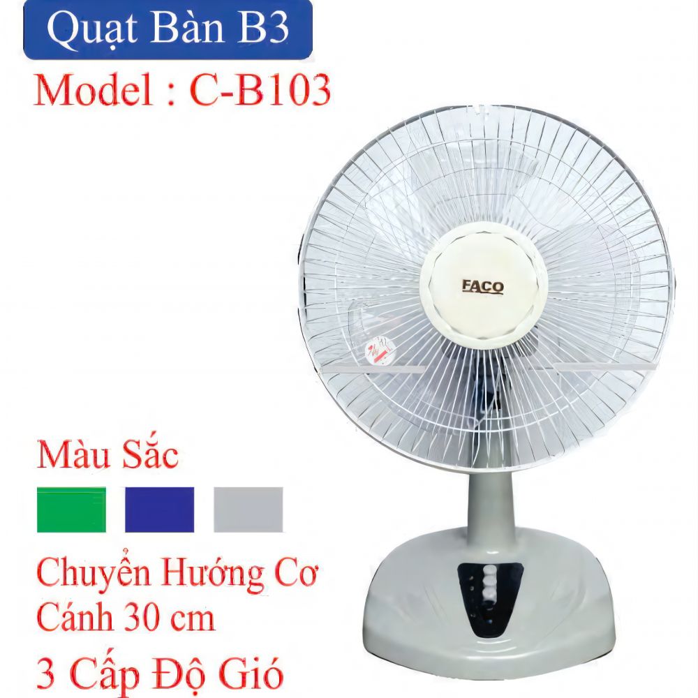 Linh Kiện Khánh Nhân - tổng kho sỉ gia dụng lớn và uy tín nhất tại TP. Hồ Chí Minh giới thiệu quạt để bàn Faco C-B103 (B3) chính hãng. Sản phẩm với thiết kế nhỏ gọn, công suất mạnh mẽ và khả năng điều chỉnh linh hoạt, mang đến làn gió mát cho không gian sống và làm việc. Đáp ứng tiêu chí "TIỆN ÍCH - CHẤT LƯỢNG - GIÁ RẺ".