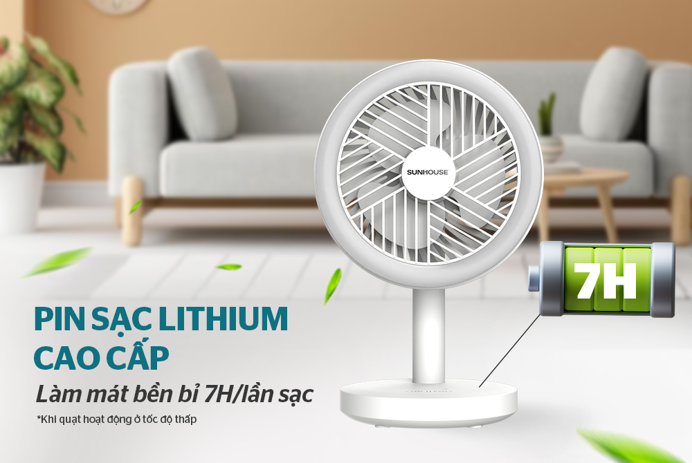 Một trong những ưu điểm vượt trội của quạt sạc Sunhouse SHD7114 là được trang bị pin lithium cao cấp với dung lượng lớn. Quạt có thể hoạt động liên tục từ 3-7 giờ tùy theo tốc độ gió sau mỗi lần sạc đầy.