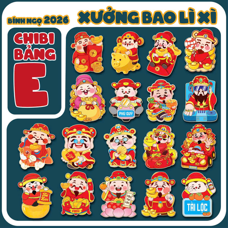 Set 10 bao lì xì Chibi Tết Bính Ngọ 2026 mang phong cách dễ thương, vui nhộn với các hình Chibi ngộ nghĩnh, tượng trưng cho sự may mắn và niềm vui đầu năm mới. Thiết kế sắc nét, màu sắc tươi sáng, phù hợp biếu tặng trẻ em, bạn bè hoặc làm quà trang trí Tết. 🧧✨