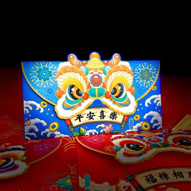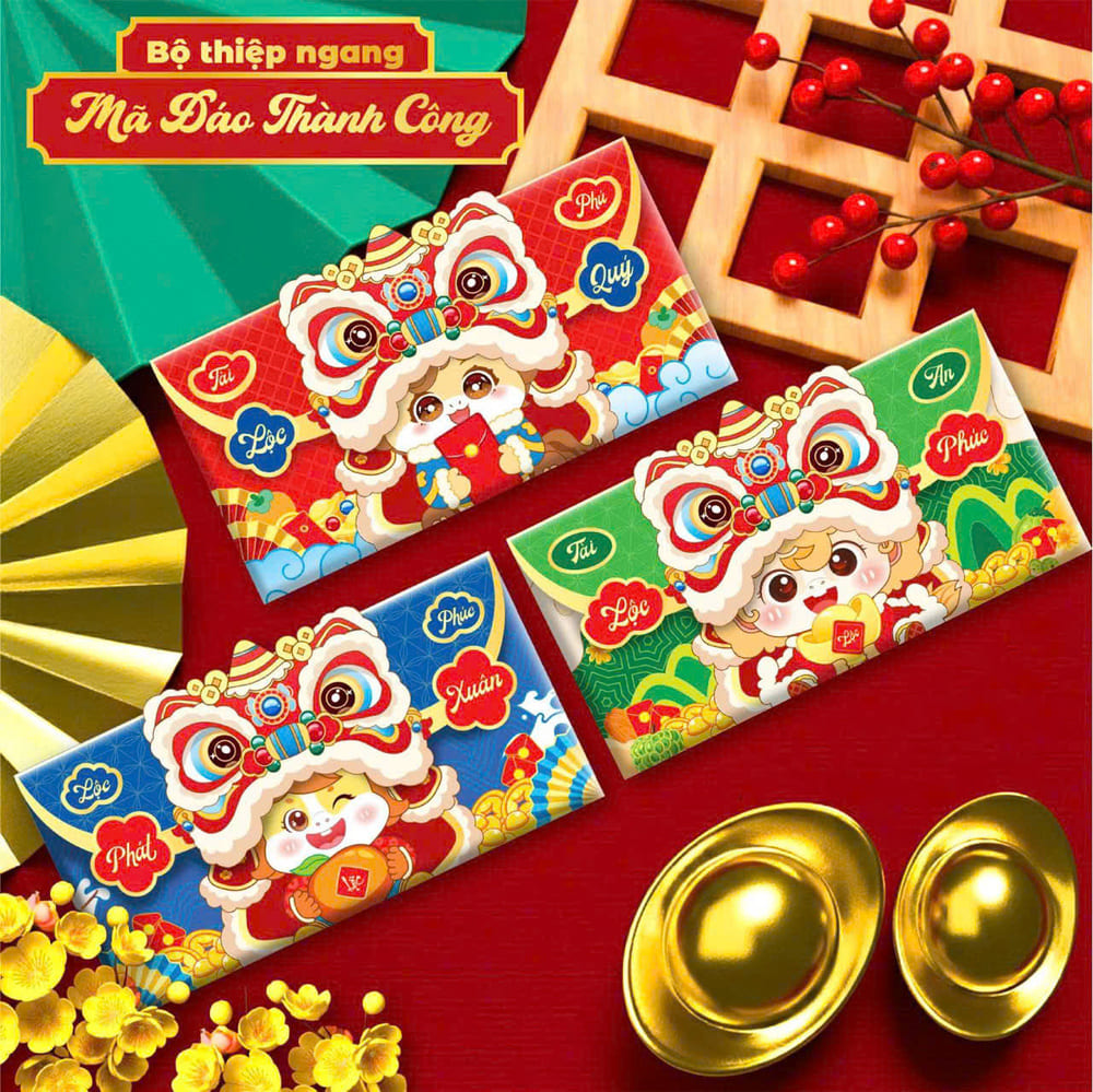 Set 3 bao lì xì đầu lân ngang mang hình ảnh múa lân truyền thống rộn ràng, tượng trưng cho tài lộc, may mắn và khởi đầu thuận lợi trong năm mới. Thiết kế dạng ngang độc đáo, họa tiết sắc nét, phù hợp để mừng tuổi người thân, bạn bè vào dịp Tết. 🧧✨
