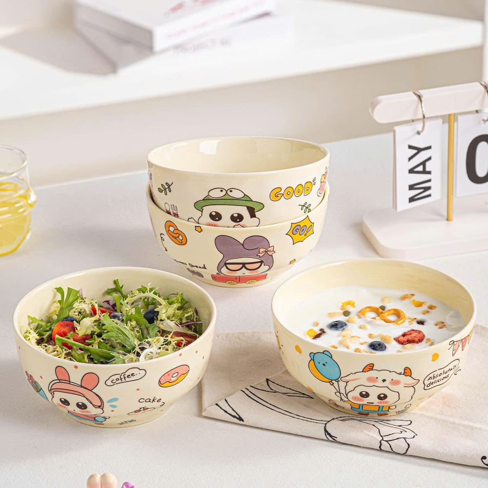 Set 4 bát sứ ăn cơm siêu cute hình hoạt hình size 4.5inch là bộ bát tiện dụng và đáng yêu, mang đến không khí vui tươi cho mỗi bữa ăn. Được làm từ sứ cao cấp, sáng bóng, an toàn cho sức khỏe, sản phẩm có khả năng chịu nhiệt tốt, dễ vệ sinh và sử dụng được trong lò vi sóng. Mỗi bát được trang trí hình hoạt hình ngộ nghĩnh, màu sắc sinh động, phù hợp cho cả người lớn lẫn trẻ em.