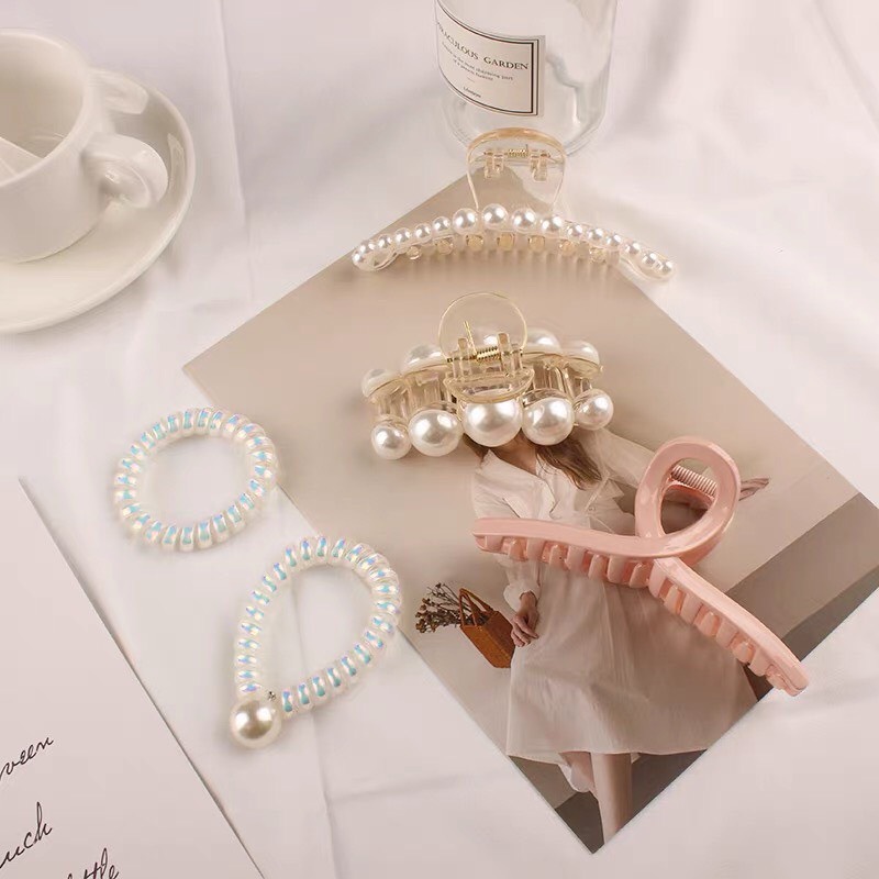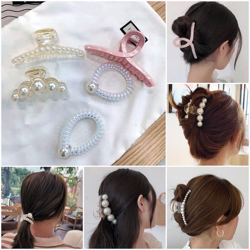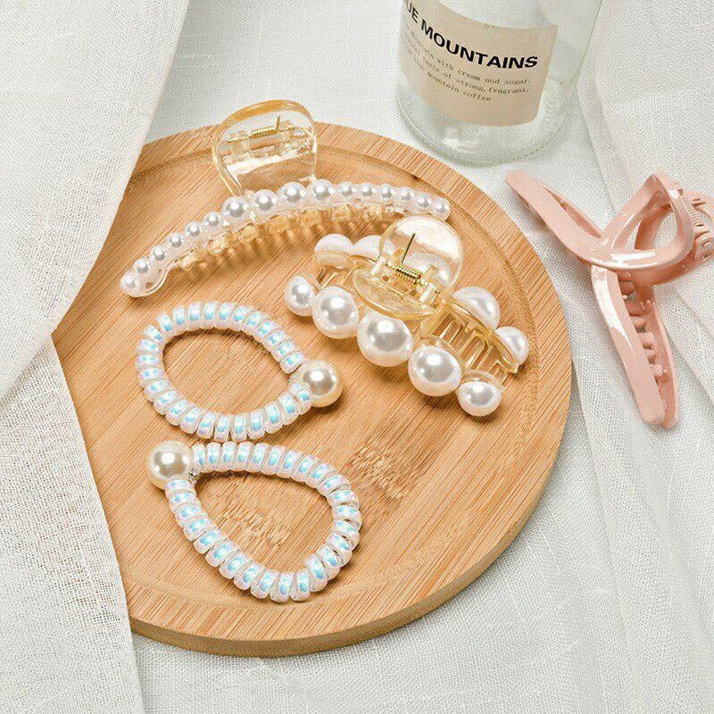 Set kẹp, cột tóc ngọc trai 5 món Hàn Quốc kèm túi đựng sang chảnh