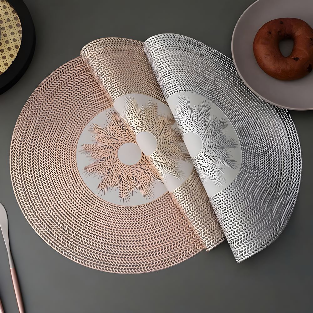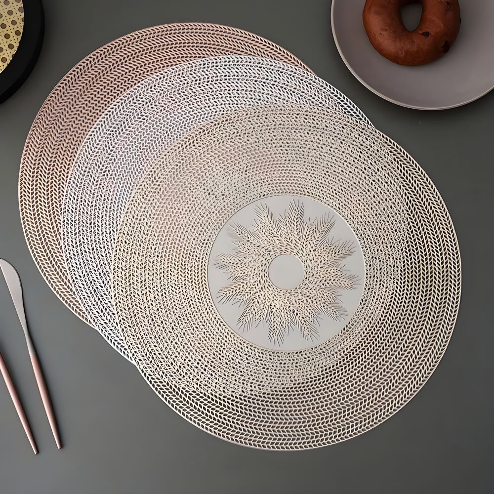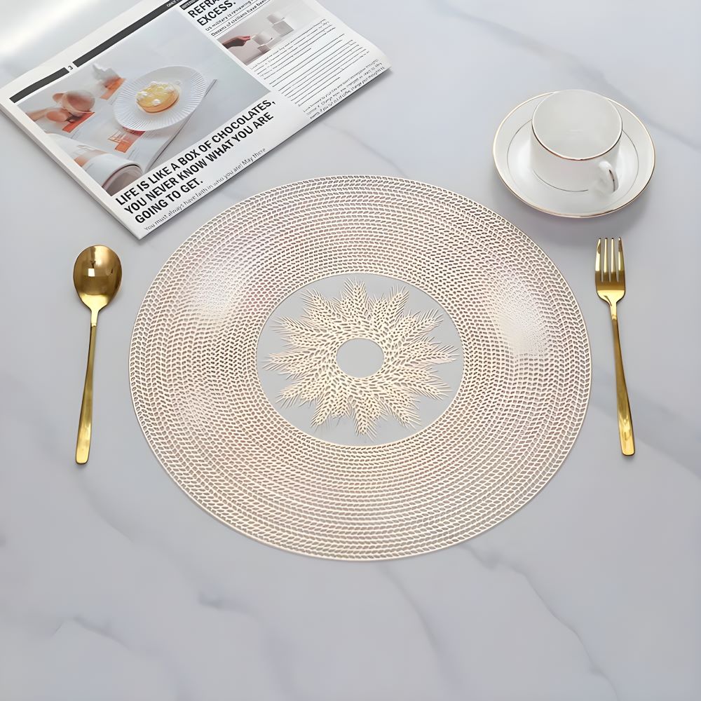 Tấm lót bàn ăn hình tròn với họa tiết lúa mì tinh tế ở trung tâm mang đến vẻ đẹp tự nhiên và sang trọng. Các gam màu trang nhã như gold hồng và silver bạc dễ dàng phối hợp với nhiều phong cách trang trí nội thất khác nhau, từ hiện đại đến cổ điển.